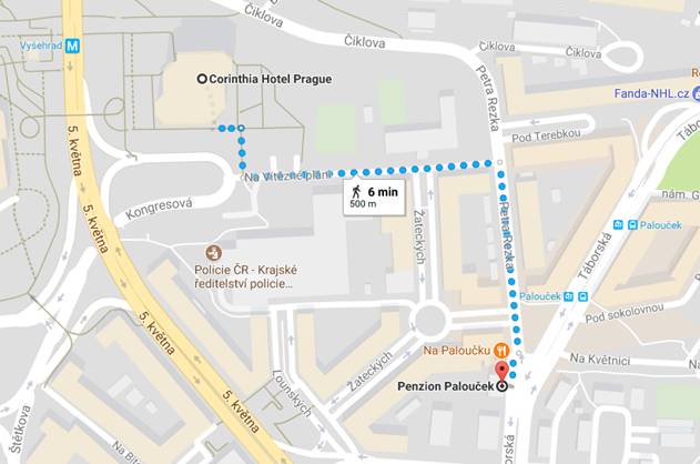 The Guest house is just 500 meters from the venue. It doesn´t take more than 10 minutes to walk there. Take the street "Petra Rezka" street and then you turn to "Na Vítězné pláni" (please see map below). Metro stop "Vyšehrad" on red C line is the most convenient to get to the hotel.